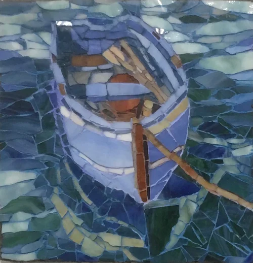 36x20”, whale bone, beach glass, stone, driftwood,pique assiette, tempered glass and watercolor on Wedi board substrate. Awarded Best in Show in the New England Mosaic Society 2019 Annual Juried Show, Post Road Art Center, Marlborough MA
